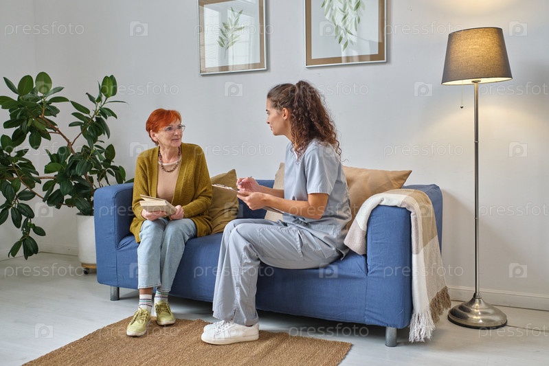 Медсестра разговаривает со старшей женщиной в комнате