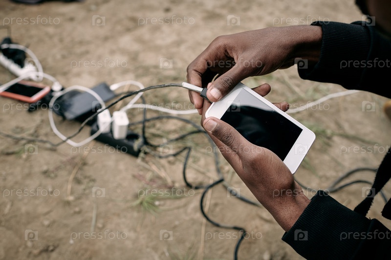 Рука мигранта-мужчины, держащего смартфон во время звонка