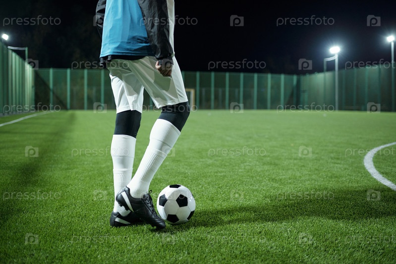 Низкая часть профессионального футболиста собирается пинать футбольный мяч