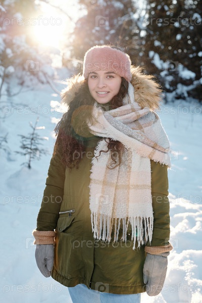 Счастливая молодая самка в зимней одежде стоит в лесу