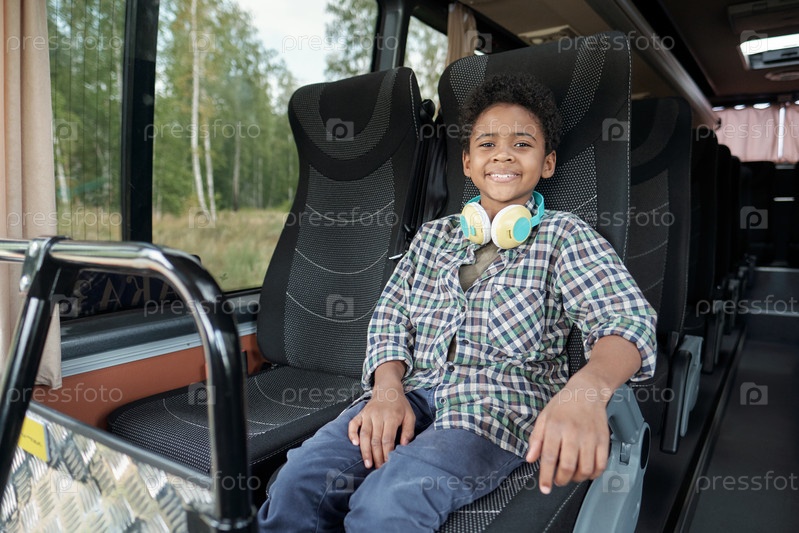 Веселый милый мальчик в повседневной одежде, сидящий на двойном кресле автобуса