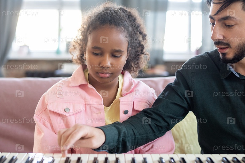 Музыкальный учитель нажимает клавишу фортепианной клавиатуры, консультируя студента из двух национальностей