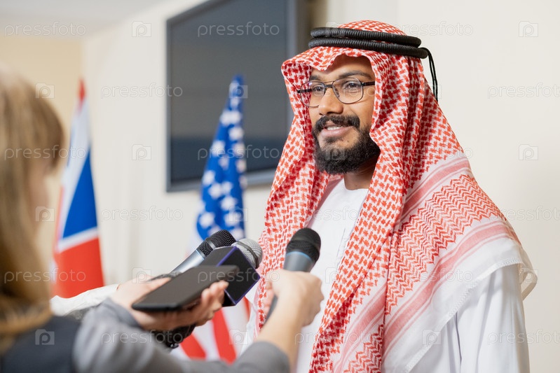 Молодой арабский бизнесмен в национальной одежде дает интервью журналистам