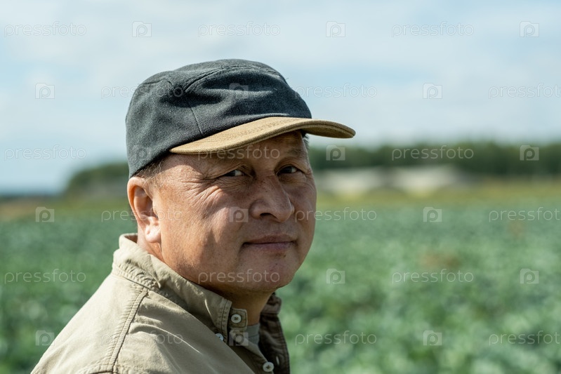 Азиатский фермер в поле капусты