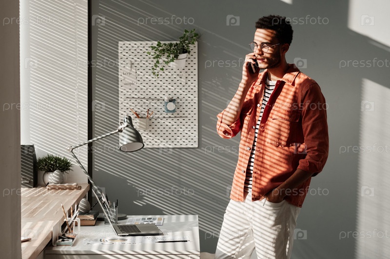 Серьезный модный молодой чернокожий мужчина в очках, стоящий в тени света через жалюзи и отвечающий на телефон