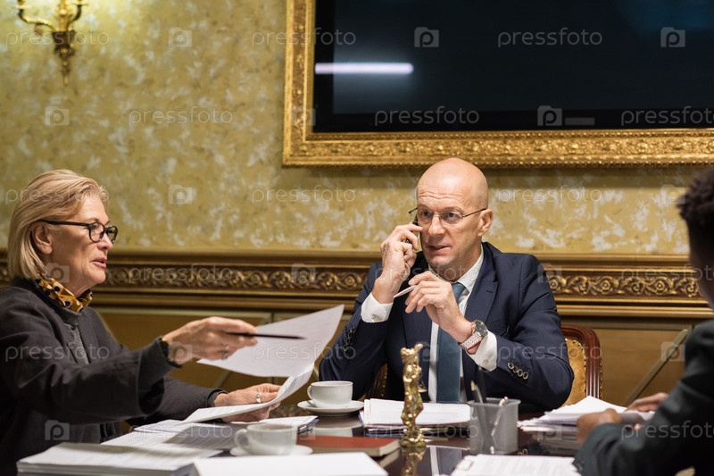 Зрелая блондинка-бизнесменка разговаривает с одним из коллег