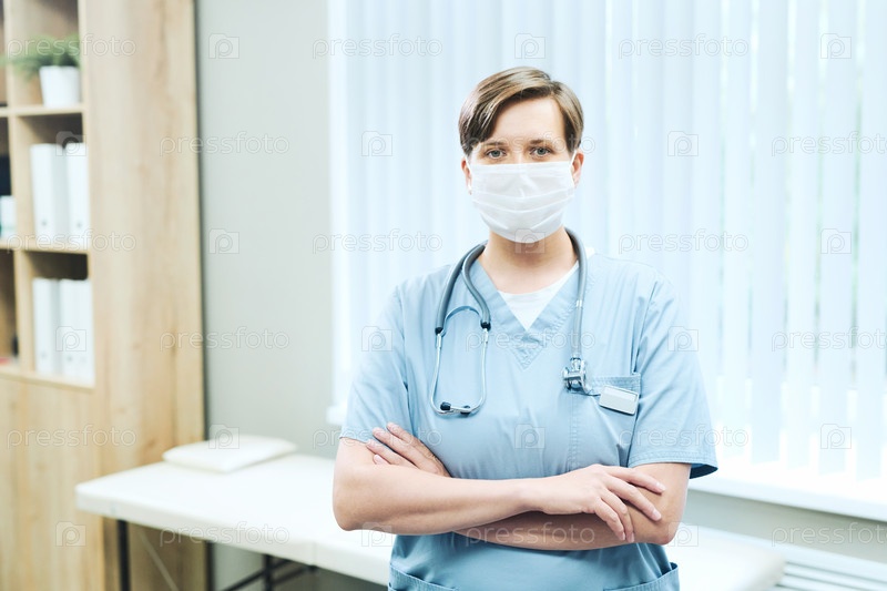 Портрет фенале медицинского стажера в лицевой маске, стоящего с перекрещенными руками на экзаменационном диване в больнице