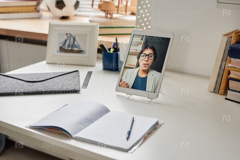Сосредоточьтесь на цифровом планшете с портретом репетитора на столе с открытой рабочей книгой и школьными принадлежностями