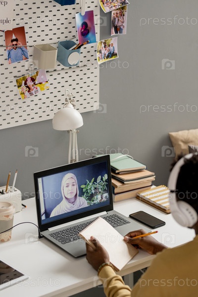 Африканский парень с карандашом и блокнотом сидит за столом перед ноутбуком