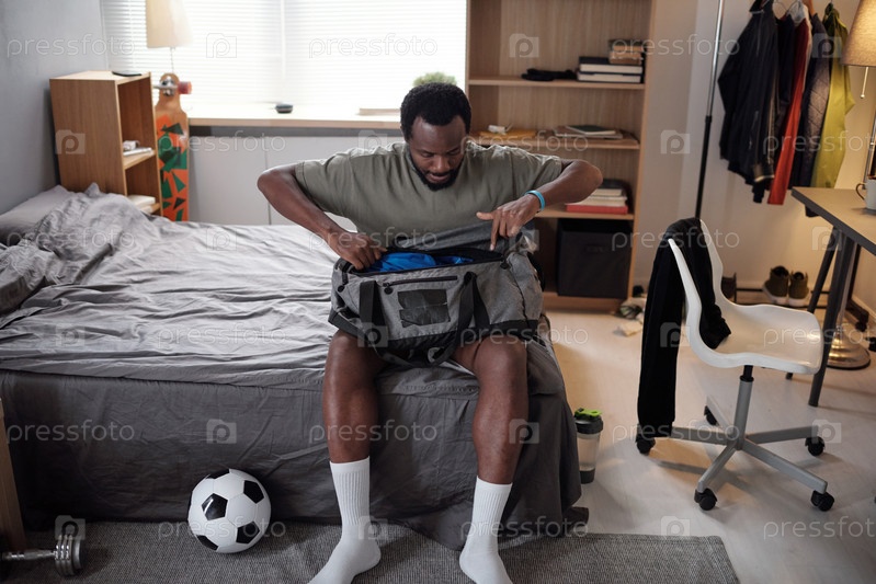 Молодой спортсмен с большой сумкой на коленях сидит в постели