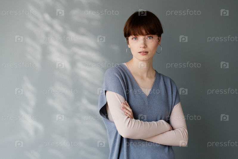 Портрет серьезной молодой женщины в серёжках, стоящей с перекрещенными руками на серой стене
