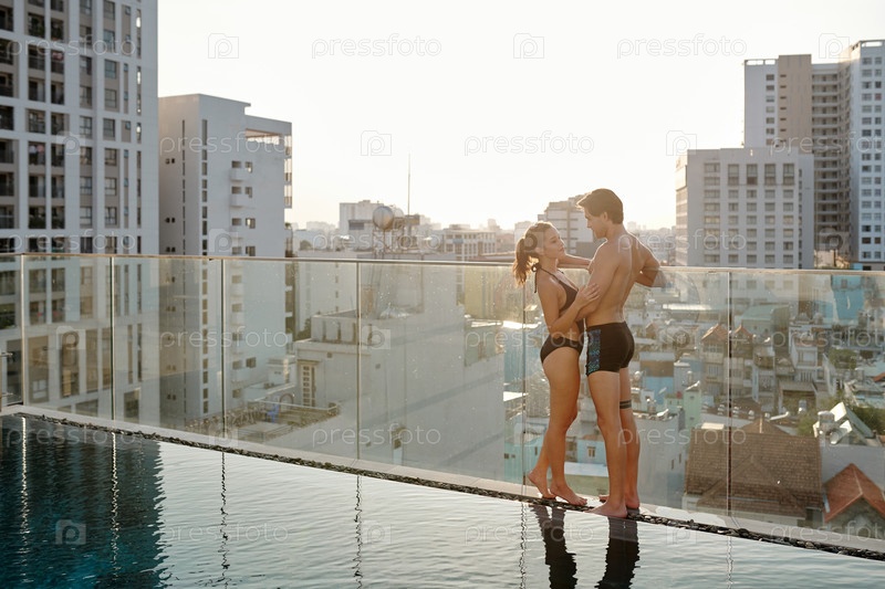 Обнимающаяся пара, стоящая на берегу бассейна