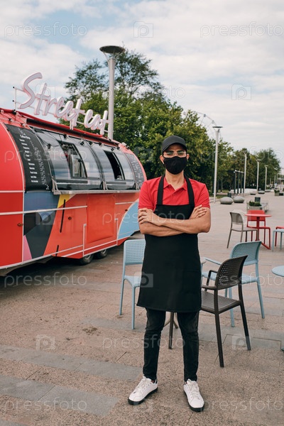 Клерк грузовика уличного питания в униформе и защитной маске