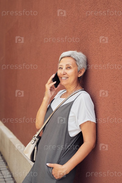 Счастливая зрелая женщина, использующая смартфон в городе