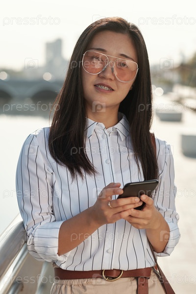 Молодая успешная китайская бизнесвумен с мобильным телефоном