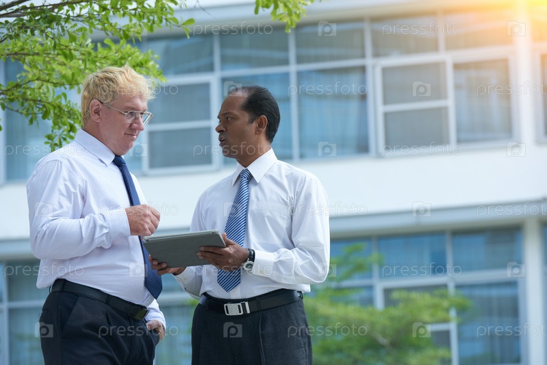 Бизнесмен показывает коллеге планшетный компьютер