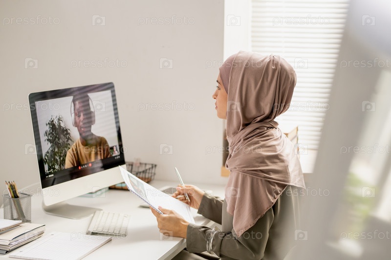 Молодая учительница с документом и ручкой смотрит на африканского студента на экране компьютера