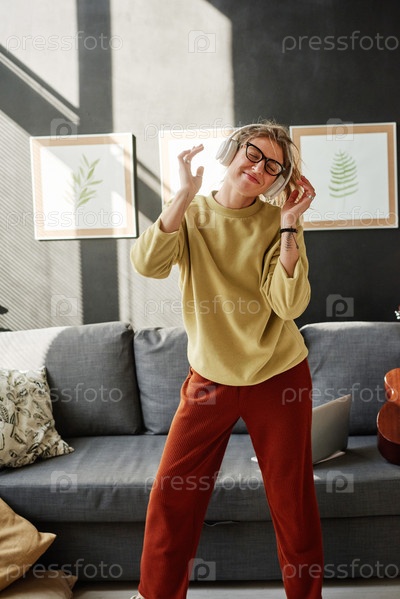 Женщина наслаждается музыкой дома