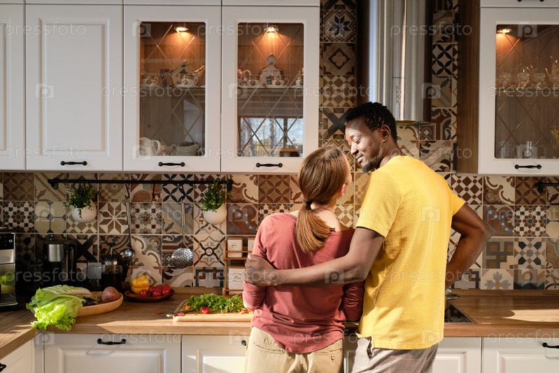 Счастливый молодой межкультурный муж и жена, стоящие за столом и готовя вместе еду