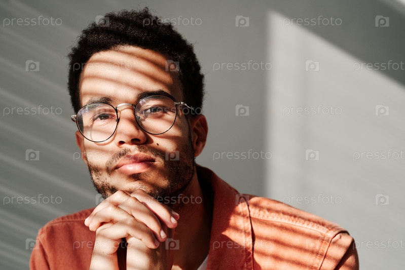 Главный снимок содержания молодой чернокожий мужчина со стержнем, опирающийся головой на зажатые руки в тени жалюзи