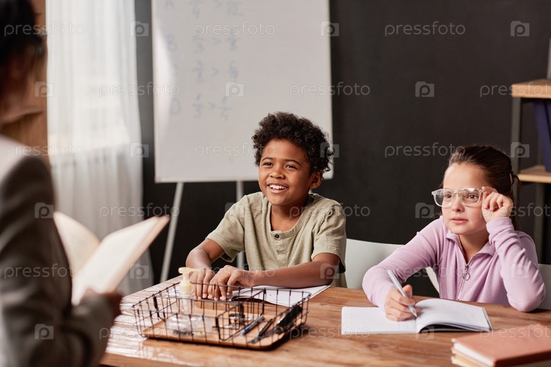 Улыбающийся чернокожий мальчик и серьезная ботаница сидят за столом с тетрадью, слушая учителя на уроке