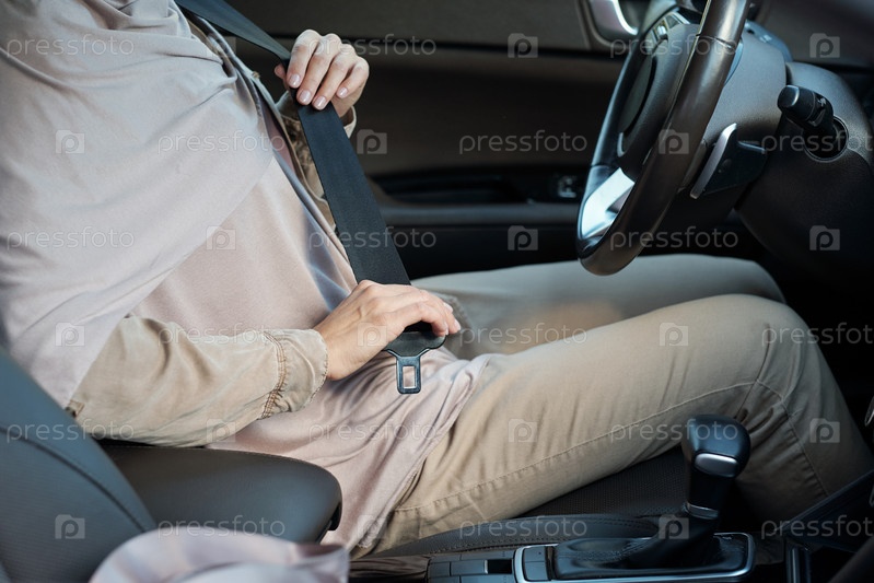 Нижняя часть молодой мусульманки, пристегивающей ремень безопасности