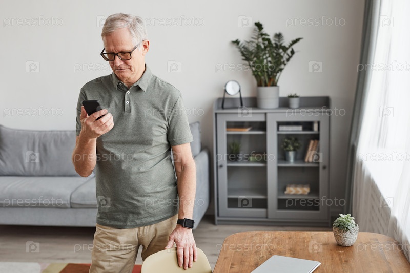 Старший мужчина в сером интерьере