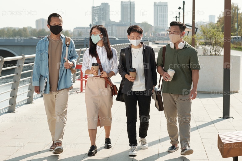 Группа молодых азиатских коллег движется вдоль берега реки