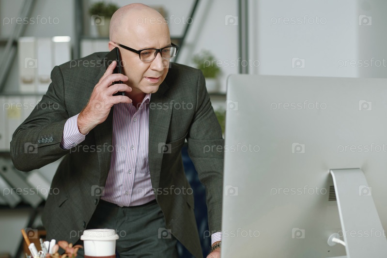 Бизнесмен, работающий по телефону в офисе
