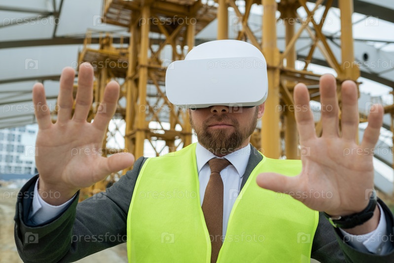 Строительный работник, использующий очки VR на работе