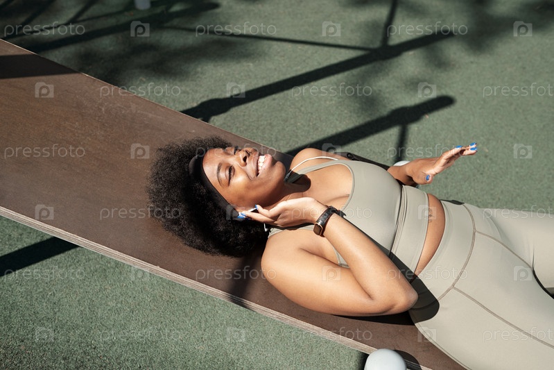 Счастливая молодая расслабленная женщина, слушающая музыку в наушниках