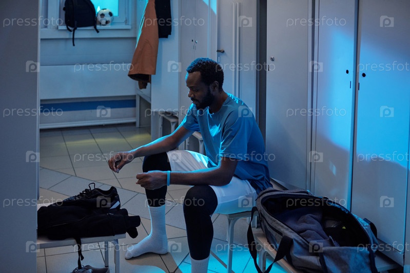 Молодой футболист собирается надеть свои спортивные ботинки