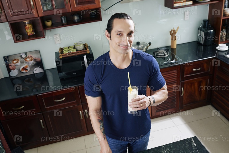 Молодой человек пьет белковый коктейль