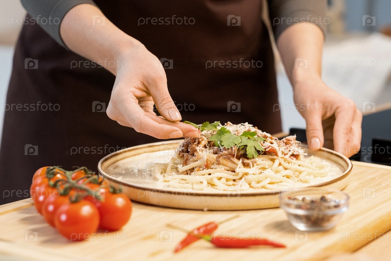 Руки женщины украшают верх кипяченого спагетти с листьями петрушки
