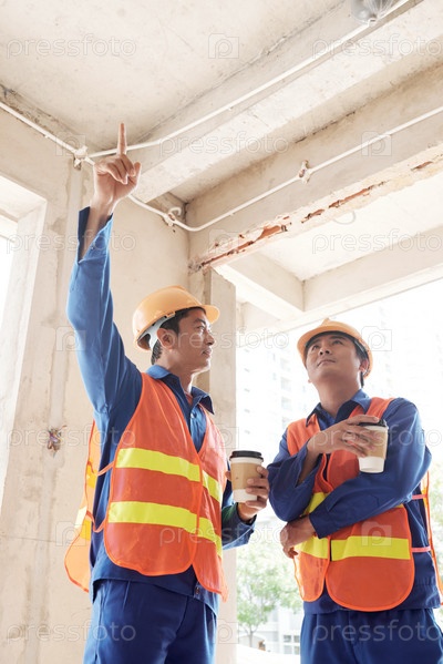 Подрядчики обсуждают потолочные плиты