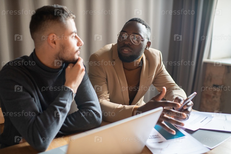 Молодой уверенный в себе бизнесмен объясняет рабочий пункт коллеге-мужчине