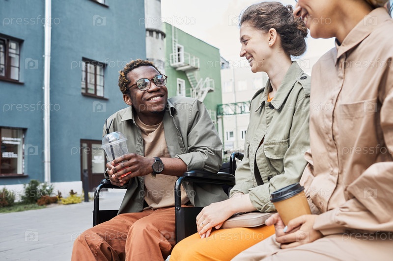 Веселый чернокожий инвалид смеется с друзьями