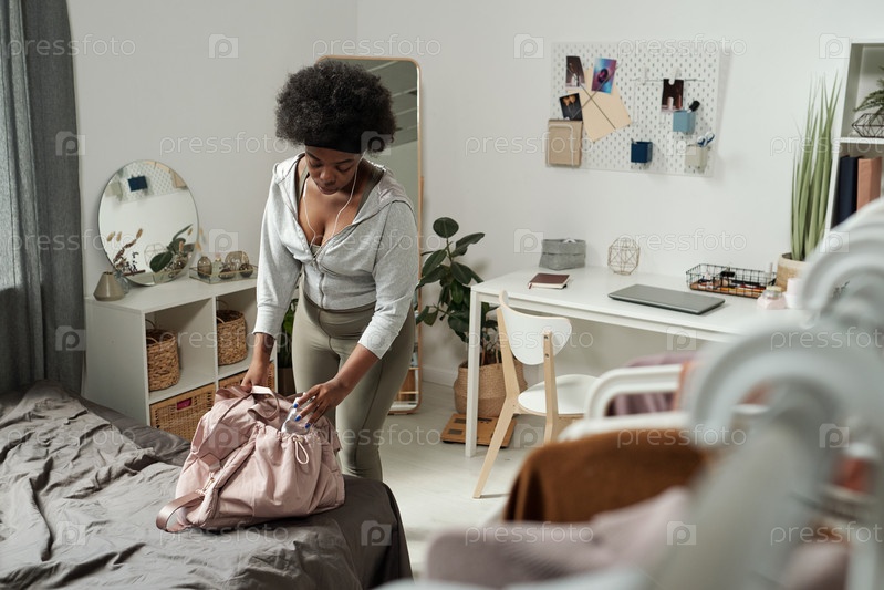 Молодая спортсменка наклоняется над кроватью, кладя бутылку с водой в сумку