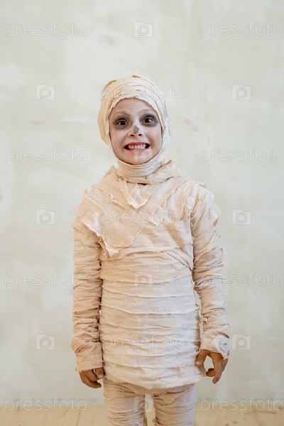 Милый мальчик в костюме мумии, стоящий на белой стене