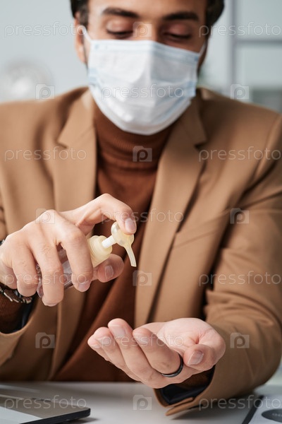 Молодой человек в бежевом куртке сидит за столом и использует дезинфицирующее средство для рук в офисе