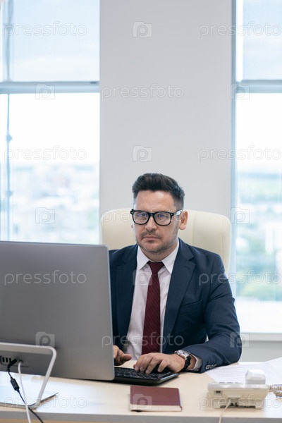 Загруженный мужчина в формальной одежде печатает на клавиатуре компьютера