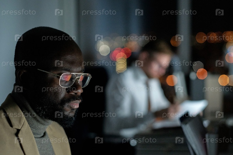 Молодой серьезный бизнесмен в очках смотрит на экран компьютера