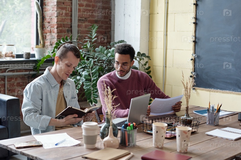 Два молодых межкультурных бизнесмена в работе по планированию повседневной одежды
