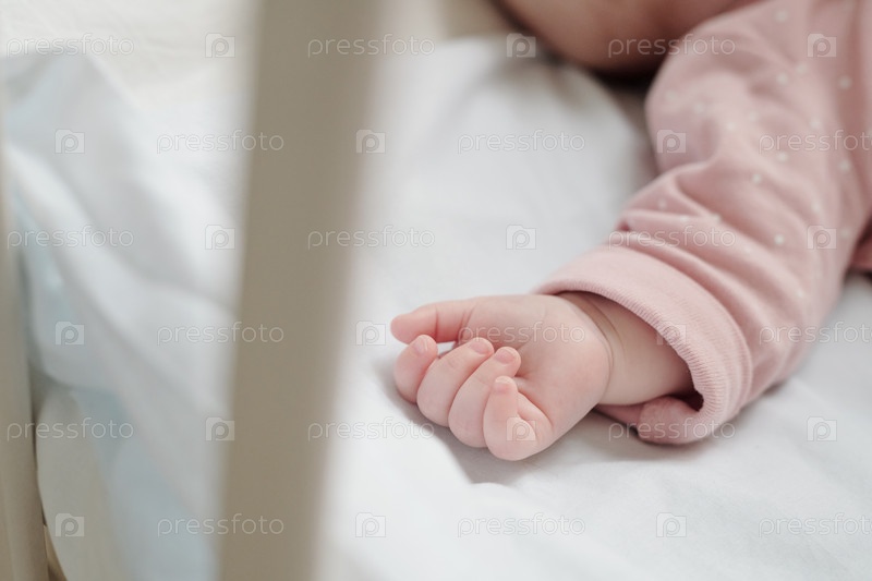 Маленькая рука милого младенца в розовом детском свободном куртке