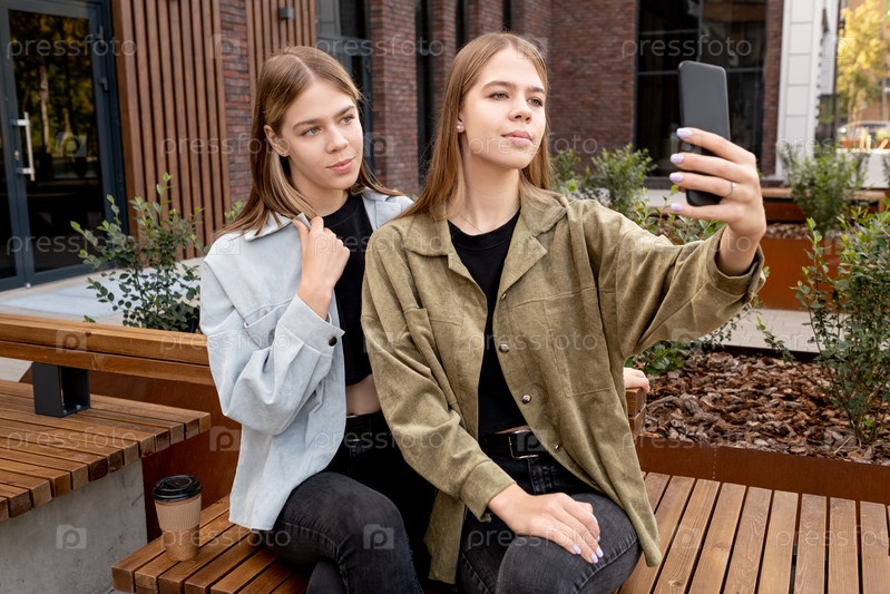 Красивые подростковые близнецы делают селфи, сидя на скамейке
