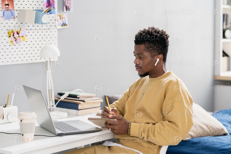 Серьезный молодой студент африканской этнической принадлежности делает заметки