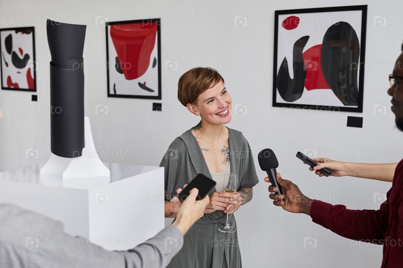 Женщина-художник дает интервью на открытии художественной галереи