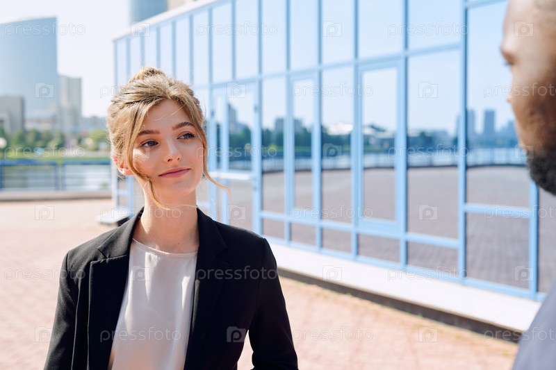 Молодая красивая бизнес-леди в формальной одежде смотрит на своего африканского коллегу
