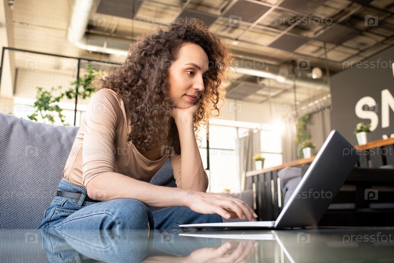 Красивая деловая женщина в повседневной одежде смотрит на дисплей ноутбука у стола в кафе