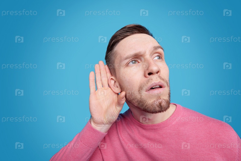 Молодой бородатый мужчина в розовом пуловере держит руку за правое ухо, подслушивая